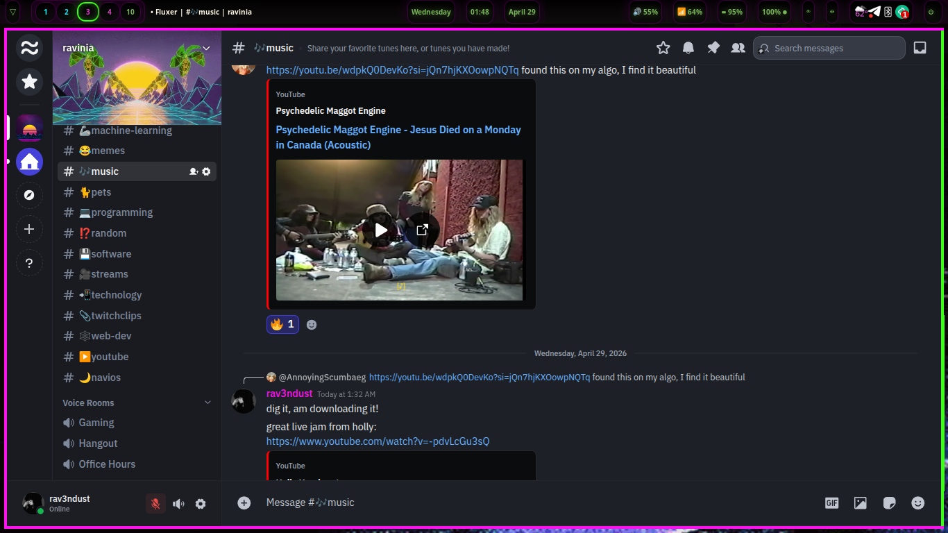 Want to switch over from Discord to something that is open-source, private, and (soon to be) federated and self-hostable? Fluxer is the answer to the Discord question, for us in Ravinia at least. I invite you to join us! If you like programming, the open Web, GNU/Linux, music, art, streaming, video games, homesteading, writing, creating things, or just chilling out with like-minded, relaxed people, you will have a good time in Ravinia.